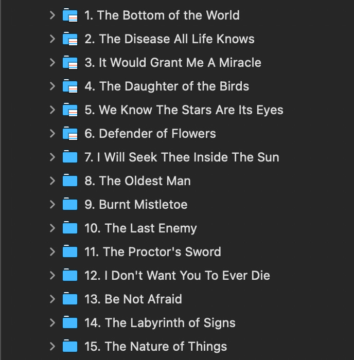 The first draft was an increasingly laggy google doc, this draft is in Scrivener. I quite like it for organising things, and I’m slowly figuring out how to make the most use out of it.